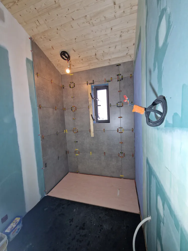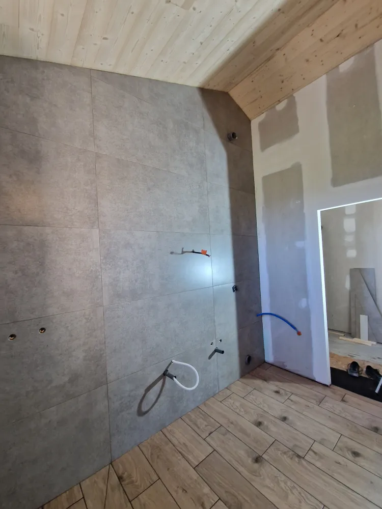 Pose murs 60x120 REFIN effet béton avec hauteur sous plafond de 3,60m au plus haut des sous-pentes du plafond.