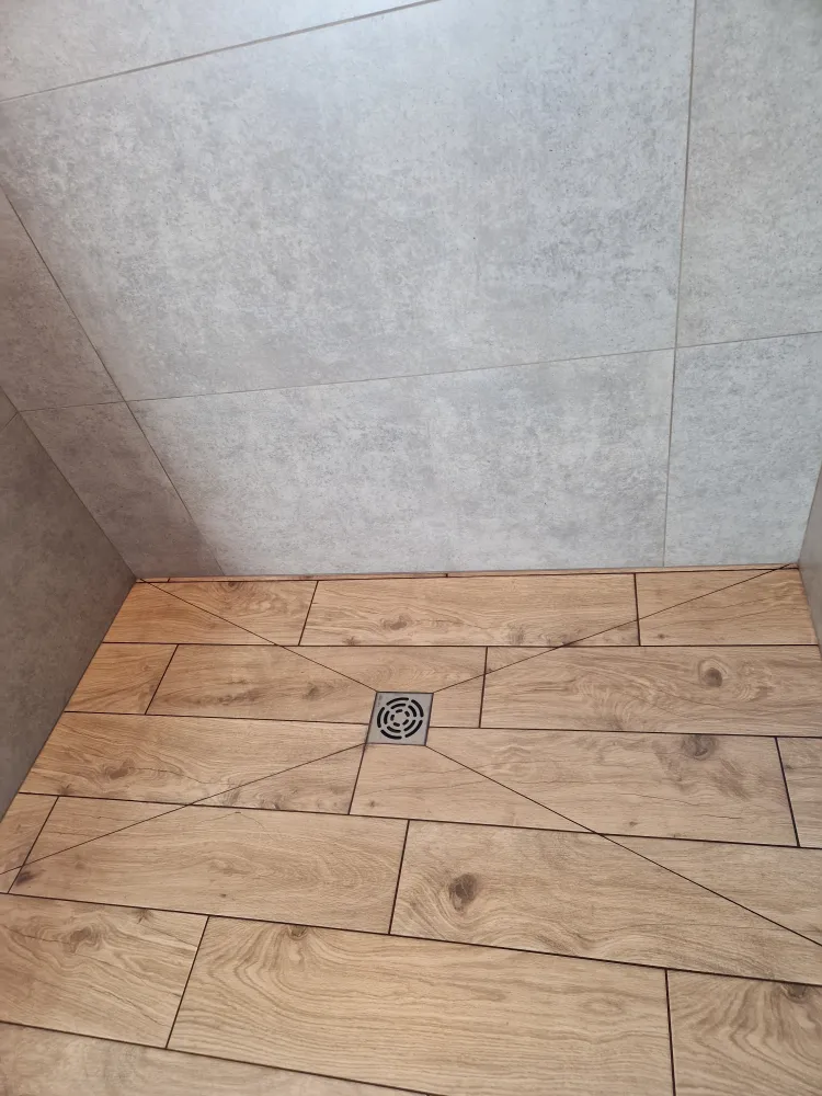 Pose sol 22x100 COLORKER effet bois avec découpe de la point de diamant pour les formes de pentes avec le passage d'un pad de finition.