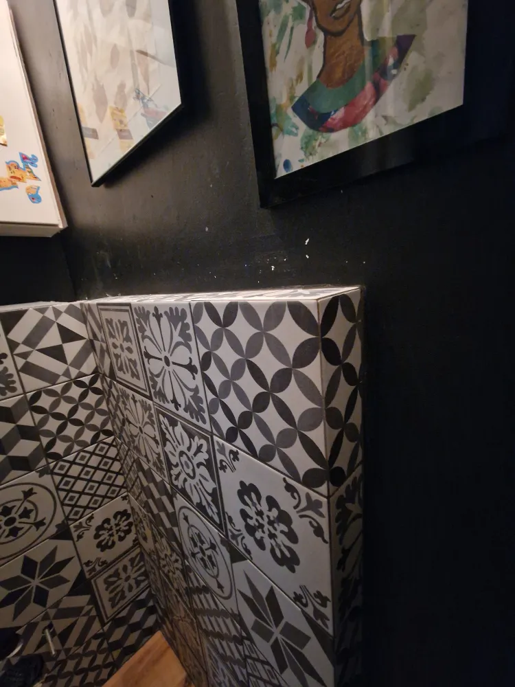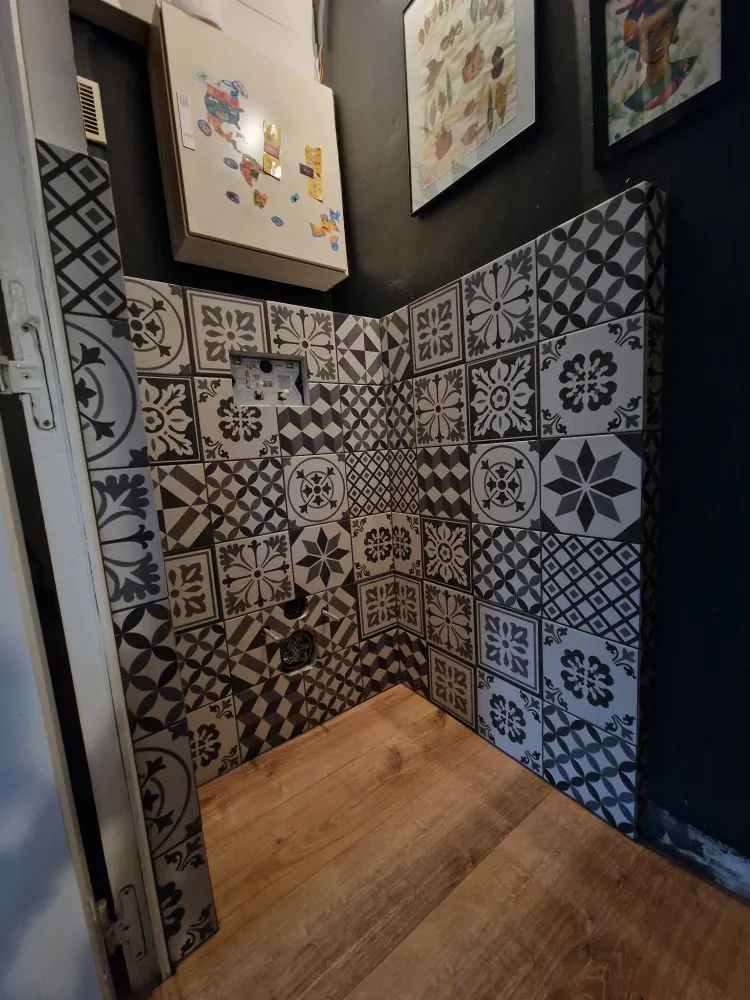 Etant donné que l'habillage avait été réalisé en médium il a fallu ratisser le support ainsi que le carrelage existant à la colle en pâte pour une meilleure adhérence.